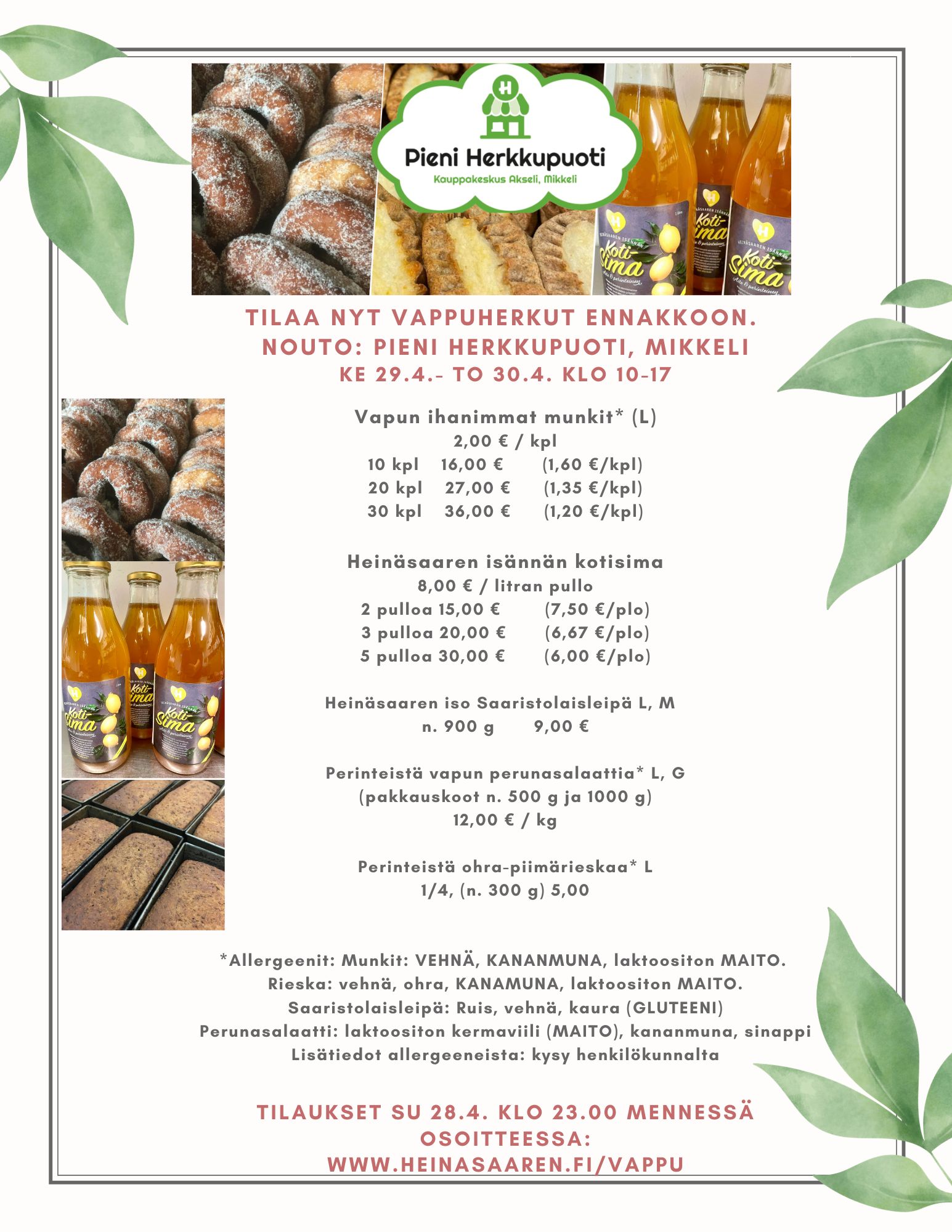 Heinäsaaren munkkikattilat porisevat jälleen vappuviikolla! Tilaa nyt Mikkelin taatusti tuoreimmat munkit, simat ja muut herkut ennakkoon. Pakkaamme tuotteet valmiiksi noutoa varten. Tilaus onnistuu kätevästi tässä alta löytyvällä lomakkeella. Iloisiin vappunäkemisiin! =)
